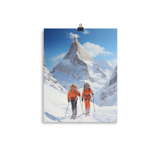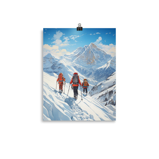 Ski Poster Print, Mountaineering Mountains Skiing Snow Wall Image Art Vertical Travel Paper Artwork Small Large Cool Room Decor