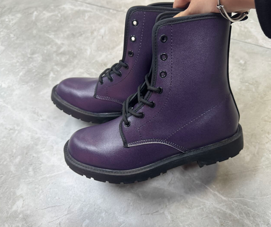 Dark Purple Combat Boots, Eggplant Women Men Vegan Leather Lace Up Shoes Hiking Festival Black Ankle Work Winter Casual Ladies