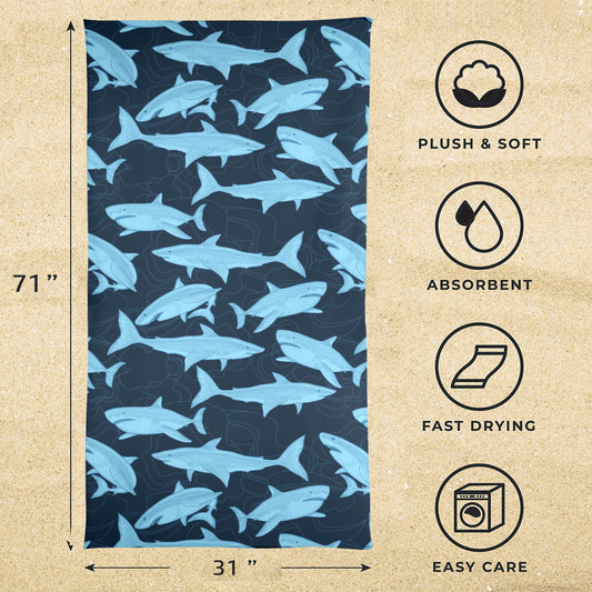 Great White Shark Oversized Beach Towel, Ocean Sea Navy Blue Pool Microfiber Extra Large Swim Quick Dry Surf Designer Men Women XL Cotton
