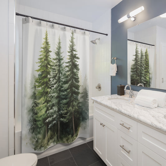 Farmhouse Shower Curtain, Trees Evergreen Green Country Forest Fabric Unique Bath Bathroom Decor Cool Unique Housewarming Gift 71" x 74"