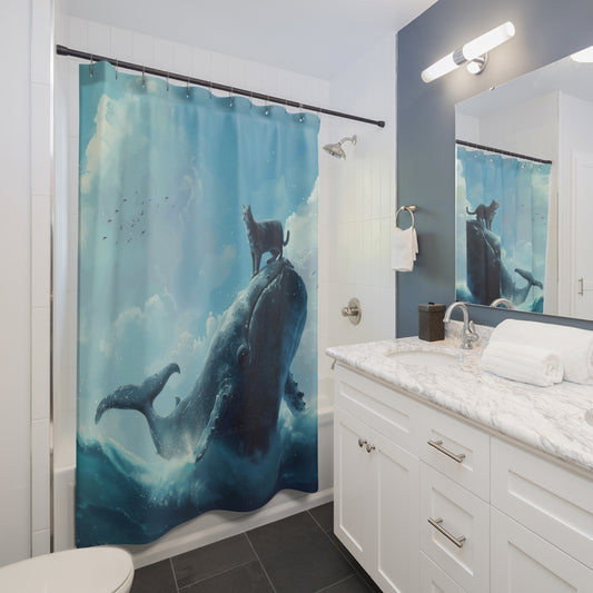 Cat Riding Whale Shower Curtain, Ocean Sea Coastal Fabric Unique Bath Bathroom Decor Cool Unique Housewarming Gift 71" x 74"