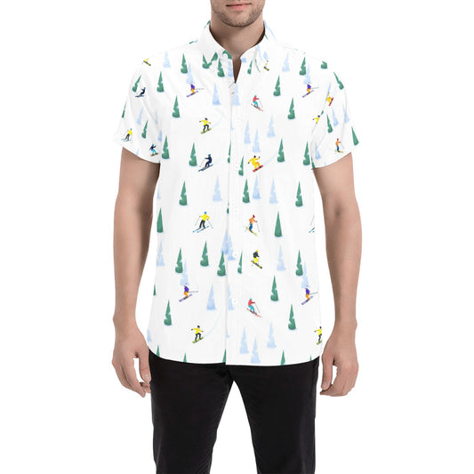 Ski Short Sleeve Men Button Up Shirt, Winter Snow Mountain Trees Skiing White Print Casual Buttoned Down Summer Dress Shirt