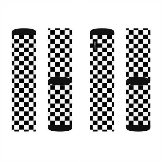 Black White Checkered Socks, 3D Printed Sublimation Check Pattern Racing Flag Women Men Fun Cool Funky Casual Cute Unique Socks