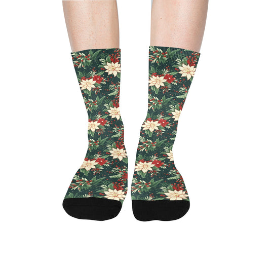 Christmas Socks, Floral Flowers Berries Green Xmas Holidays Crew Sublimation Women Men Designer Fun Novelty Cool Funky Crazy Casual Unique