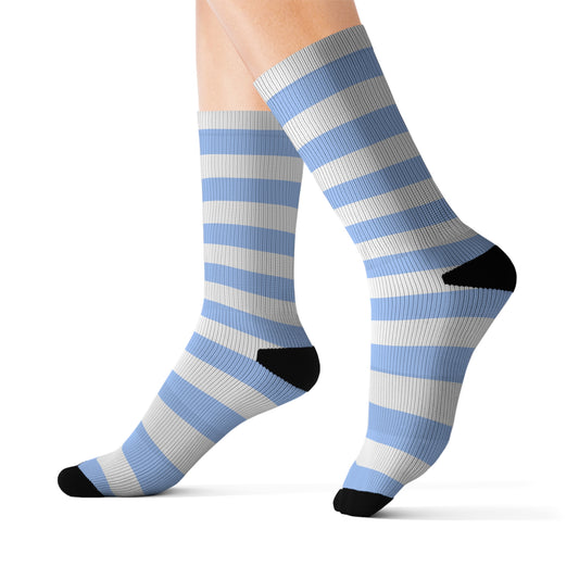 Light Blue striped Socks, White Wide Stripe Crew Sublimation Women Men Designer Fun Novelty Cool Funky Crazy Casual Cute Unique Dress
