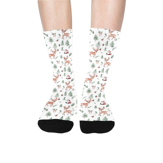 White Christmas Socks, Reindeer Trees Santa Xmas Holidays Crew Sublimation Women Men Designer Fun Novelty Cool Funky Crazy Casual Unique