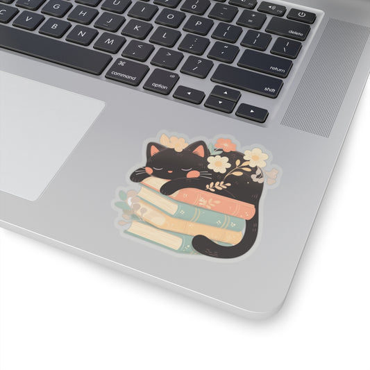 Black Cat Sleeping Books Sticker Decal, Anime Pastel Floral Reading Art Vinyl Laptop Cute Waterbottle Tumbler Car Waterproof Bumper Clear