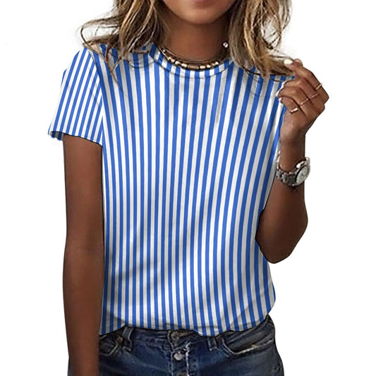 Blue White Striped Women Cotton Tshirt, Vertical Stripes Ladies Female Designer Graphic Aesthetic Fashion Fitted Crewneck Tee Shirt Top