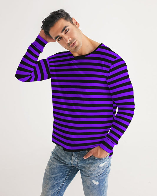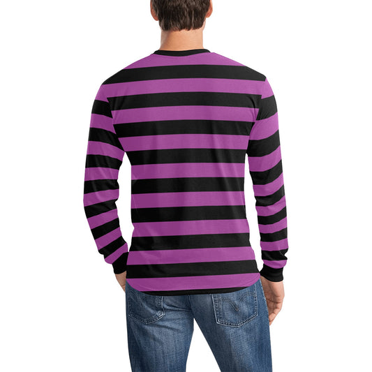 Black and Purple Striped Men Long Sleeve TShirt, Vintage Retro Stripe Costume Stripes Crewneck Unisex Women Designer Tee