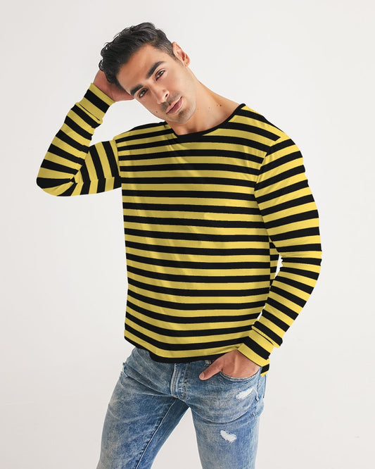 Black and Yellow Striped Men Long Sleeve Tshirt, Horizontal Stripe Unisex Guys Women Designer Graphic Printed Crew Neck Tee Shirt Top