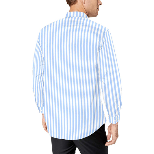 Light Blue Striped Long Sleeve Men Button Up Shirt, White Print Buttoned Collared Dress Shirt with Chest Pocket
