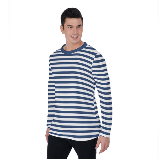 Blue and White Striped Men Long Sleeve Tshirt, Breton Unisex Guys Women Designer Graphic Aesthetic Printed Crew Neck Tee Shirt