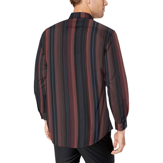 Dark Maroon Striped Long Sleeve Men Button Up Shirt, Navy Blue Vertical Print Guys Male Buttoned Collared Casual Dress Shirt Chest Pocket