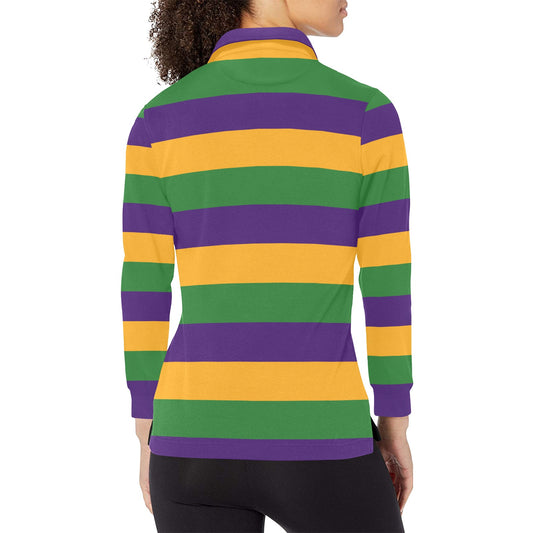 Mardi Grass Striped Women Long Sleeve Polo Shirt, Purple Green Gold Colored Designer Graphic Collared Crew Neck Ladies Female Tee Top Shirt