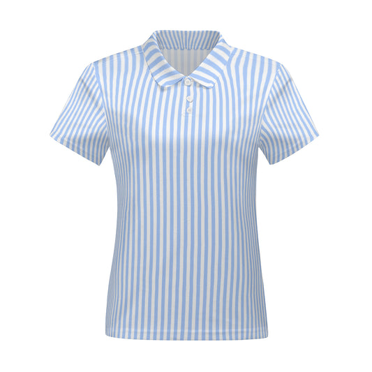 Light Blue White Striped Women Polo Shirt, Slim Fit Short Sleeve Collared Casual Summer Buttoned Down Up Sports Golf Tee Top Tshirt