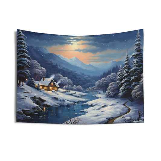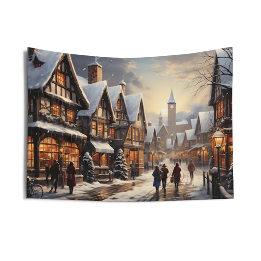 Christmas Village Tapestry, Snow Houses Xmas Wall Art Hanging Landscape Cool Unique Aesthetic Large Small Bedroom Dorm