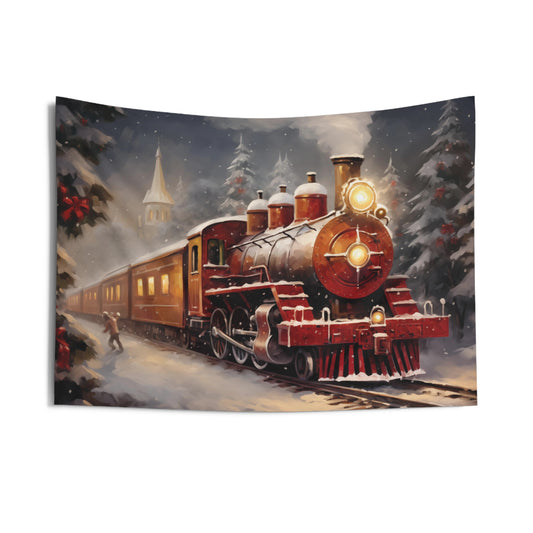 Christmas Train Express Tapestry, Xmas Trees Snow Winter Wall Art Landscape Hanging Cool Unique Aesthetic Large Small Decor Bedroom College