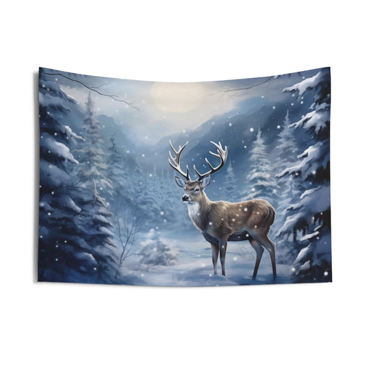 Deer Snowy Winter Scene Tapestry, Pine Trees Night Sky Stag Wall Art Landscape Hanging Cool Unique Aesthetic Large Small Bedroom College
