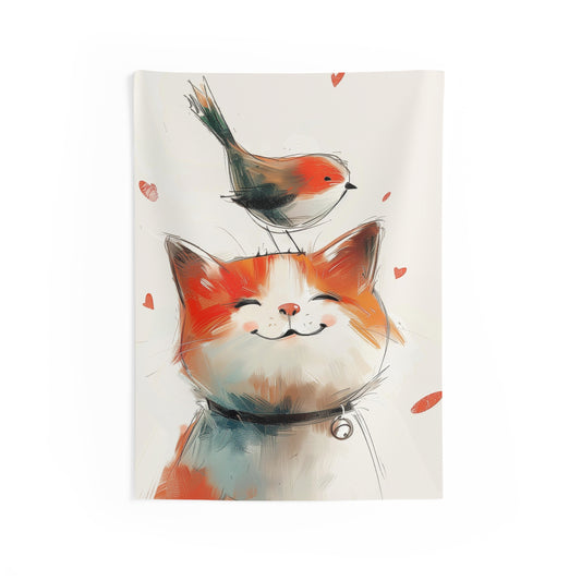 Nursery Tapestry, Cat with Bird on Head Kids Wall Art Hanging Cool Unique Vertical Aesthetic Large Small Bedroom College Dorm Room