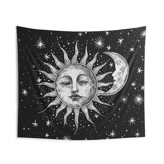 Sun Moon Stars Tapestry, Black White Vintage Retro Wall Art Hanging Unique Landscape Aesthetic Large Small Decor Bedroom College Dorm Room