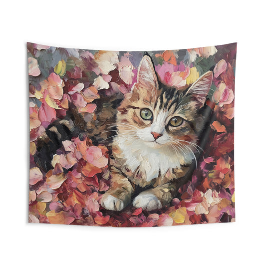 Cat in Petals Tapestry, Kitten Printed Painting Vintage Retro Wall Art Hanging Unique Landscape Large Small Decor Bedroom College Dorm Room