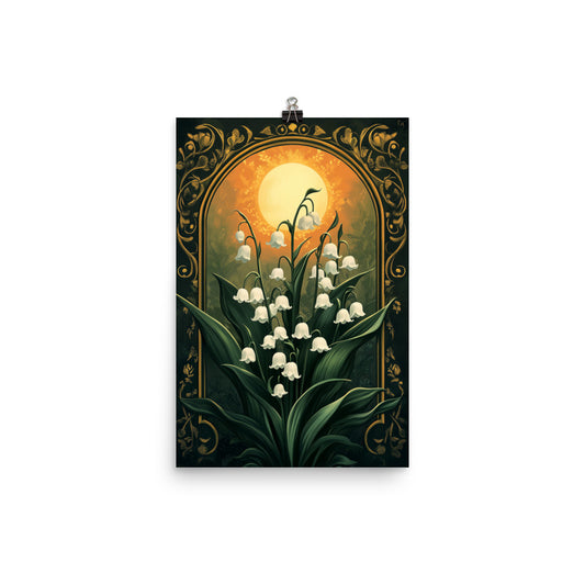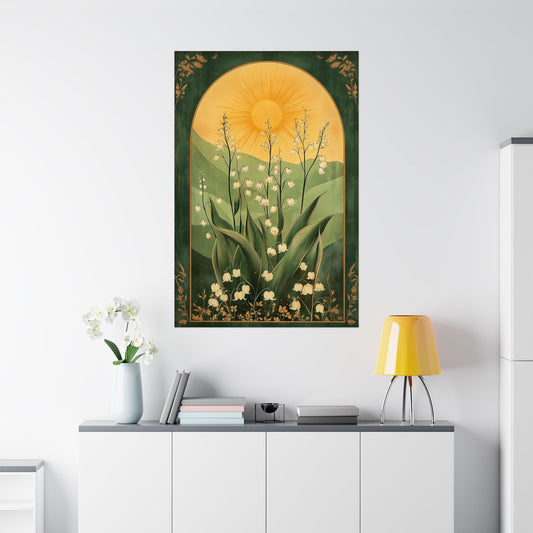 Lily of the Valley Poster, Flower Floral Sun Green Mystical Folk Boho Art Retro Vintage Print Wall Vertical Artwork Small Large Decor Paper