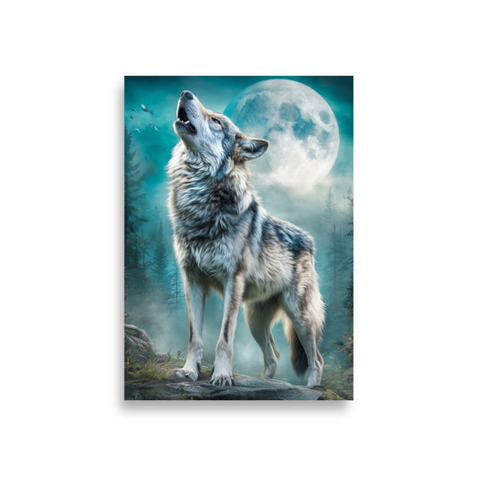 Wolf Howling Poster Print, Full Moon Animal Wall Image Art Vertical Paper Artwork Small Large Cool Room Office Decor