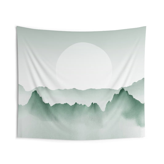 Fog Mountain Tapestry, Watercolor Pastel Green Sun Landscape Indoor Wall Art Hanging Tapestries Large Small Decor Home Dorm Room Gift