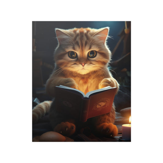 Kitten Cat Reading Poster Print, Books Satin Library Wall Image Art Vertical Paper Artwork Small Large Cool Room Office Decor