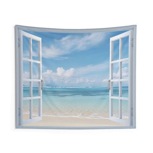 Ocean Beach Window View Tapestry, Coastal 3D Sea Wall Art Hanging Cool Unique Landscape Aesthetic Large Small Bedroom College Dorm Room