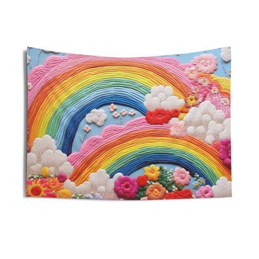 Rainbow Tapestry, Printed Embroidery Boho Floral Wall Art Hanging Cool Unique Landscape Aesthetic Large Small Bedroom College Dorm