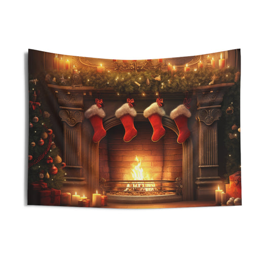 Christmas Fireplace Tapestry, Holidays Xmas Festive Wall Art Hanging Cool Unique Landscape Aesthetic Large Small Decor Bedroom College Dorm