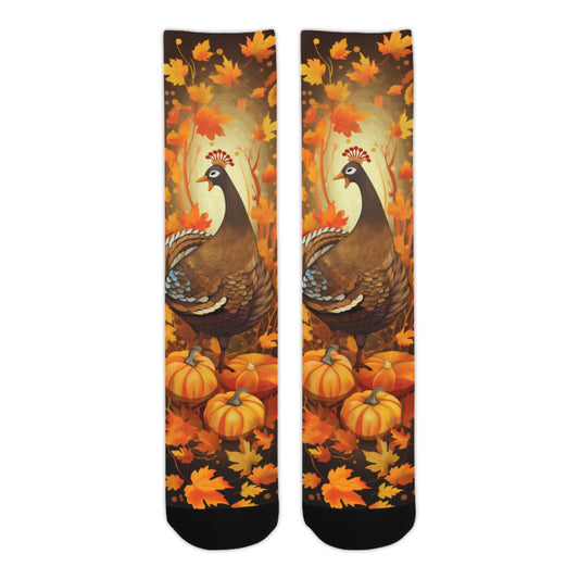 Thanksgiving Socks, Orange Fall Leaves Turkey Pumpkin Crew Sublimation Women Men Designer Fun Novelty Cool Funky Crazy Casual Unique