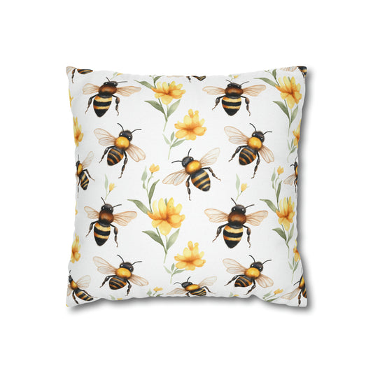 Bees Flowers Pillow Case, Yellow Floral Spring Square Throw Decorative Cover Room Decor Couch Cushion 20 x 20 Zipper Sofa
