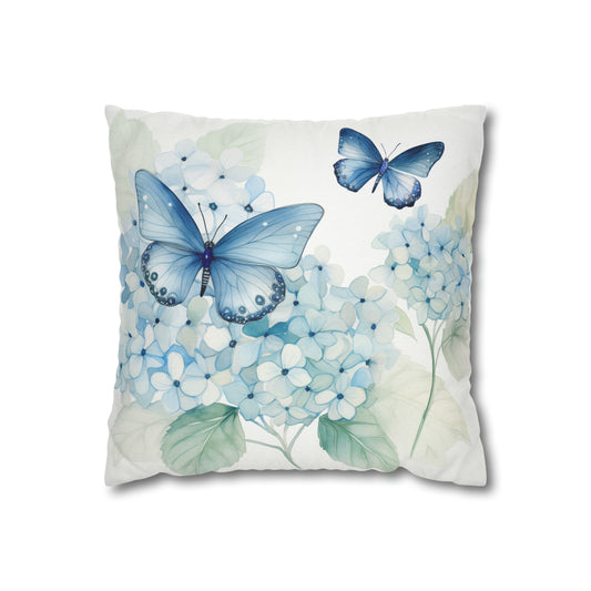 Blue Hydrangea Butterfly Pillow Cover, Floral Flowers Watercolor Square Throw Decorative Cover Room Couch Cushion 20 x 20 Zipper Sofa