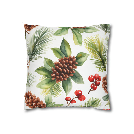 Festive Pine Cone Pillow Cover, Red Berries Botanical Christmas Xmas Watercolor Square Throw Decorative Cover Cushion 20 x 20 Zipper Holiday
