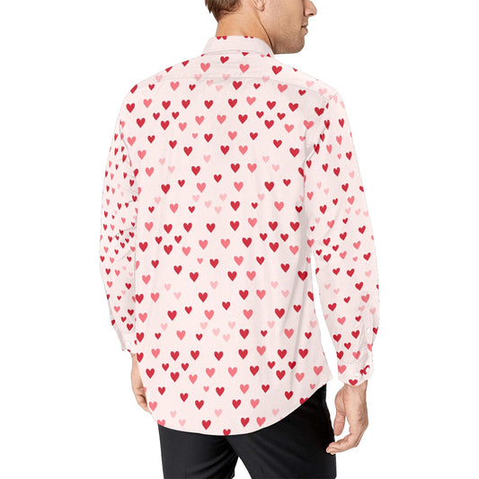 Pink Hearts Long Sleeve Men Button Up Shirt, Valentine's Day Fun Print Dress Male Buttoned Collar Casual Dress Shirt with Chest Pocket