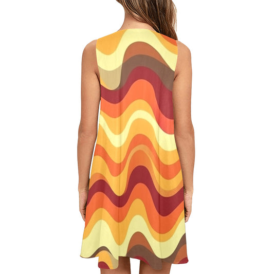 70s Wavy Stripes A Line Dress Women Pockets, Retro Vintage Brown Yellow Orange Print Sleeveless Mini Short Cute Handmade Party Sexy Casual