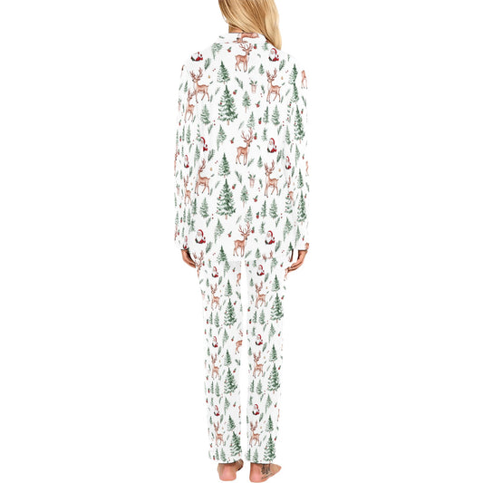 White Christmas Women Satin Pajamas Set, Reindeer Xmas Santa Ladies Female 2 Piece Pants Print Long Sleeve Top PJ Holiday Sleep Sleepwear