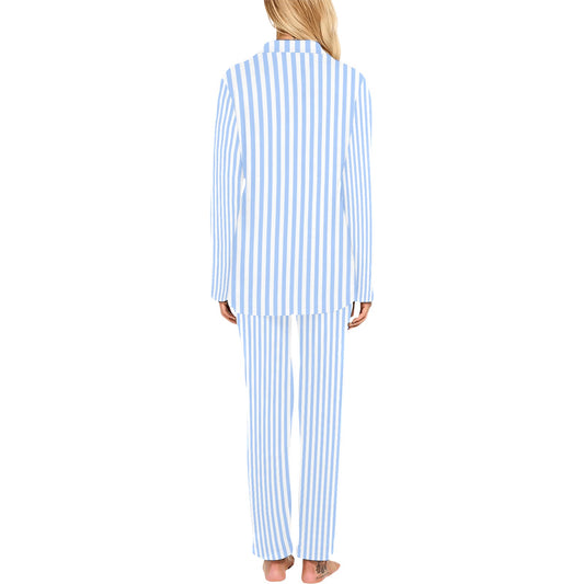Blue and White Striped Women Pajamas Set, Stripe Ladies Female 2 Piece Pants Print Top PJs Long Sleeve Sleep Sleepwear Cute Adults Nightwear