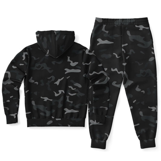 Camo Zip Hoodie Jogger Sweatsuit Set, Black Grey Camouflage Zipper Hooded Sweatshirt Sweatpants Women Men Cotton Matching Plus Size Sweats
