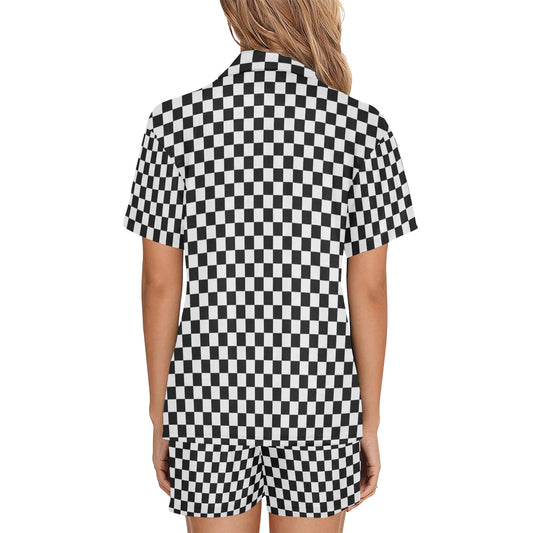 Checkered Pajamas Set, Black White Sleepwear Short Sleeve Sleep Shirt Shorts Night Plus Size Summer Bachelorette Bride Couple Designer PJs