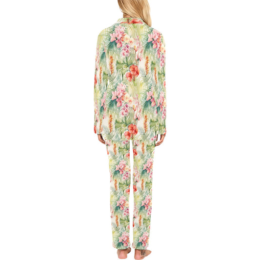 Tropical Women Pajama Set, Ladies Female 2 Piece Pants Floral Flowers Palm Leaf Green Pink Print Top PJ Holiday Cozy Sleep Sleepwear Cute