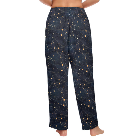 Constellation Women Pajamas Pants, Universe Space Galaxy Satin PJ Funny Pockets Trousers Couples Matching Ladies Trousers Bottoms