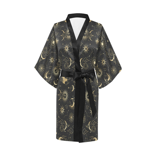 Sun Moon Kimono Robe, Stars Print Black Oriental Constellation Celestial Bathrobe Women's Short Lounge Sleepwear Pajama
