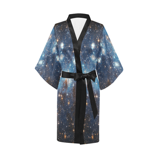 Galaxy Space Kimono Robe, Celestial Blue Outer Stars Japanese Women Ladies Short Long Lounge Sleepwear Bohemian Sexy Nerd Bathrobe Pajamas