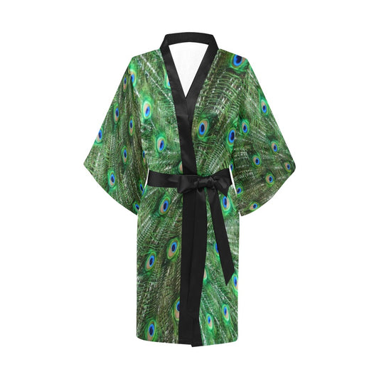 Peacock Kimono Robe, Feather Print Green Peignoir Japanese Women Short Sleeve Lounge Sleepwear Bathrobe Gift Wife