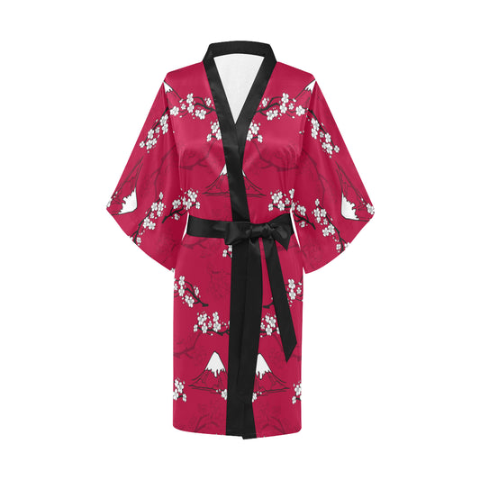 Japanese Floral Kimono Robe, Red Flowers Print Oriental Japan Peignoir Asian Women's Short Vintage Lounge Sleepwear Long Sleeve Bathrobe