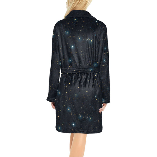 Galaxy Women Fleece Robe, Space Constellation Stars Winter Soft Plush Ladies Microfleece Peignoir Long Sleeve Mini Spa Bathrobe Plus Size