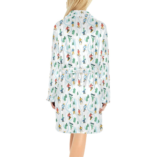 Ski Women Fleece Robe, Snowboard Skiing Winter Soft Plush Ladies Microfleece Peignoir Long Sleeve Mini Lounge Spa Bathrobe Gift Plus Size